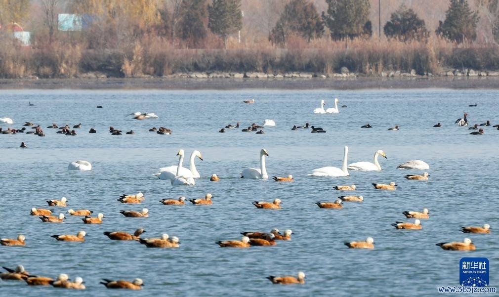 11月12日,大天鹅等鸟类在张掖黑河湿地国家级自然保护区高台段一处湖泊休憩觅食。