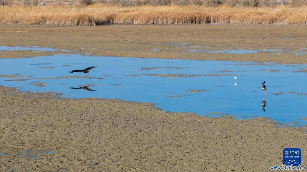 11月12日,黑鹳在张掖黑河湿地国家级自然保护区高台段一处湿地浅滩觅食。
